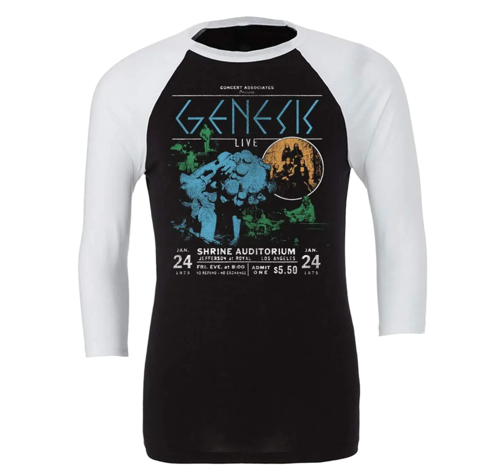 Genesis at the Shrine Auditorium 1975 Black and White Baseball Tee. On January 24, 1975 Genesis played live at Los Angeles' historic Shrine Auditorium. This iconic performance took place during the band's The Lamb Lies Down on Broadway tour, featuring the theatrical storytelling and visionary stagecraft of Peter Gabriel. This show marked a pivotal moment in the band’s history, capturing the essence of their groundbreaking double concept album.
